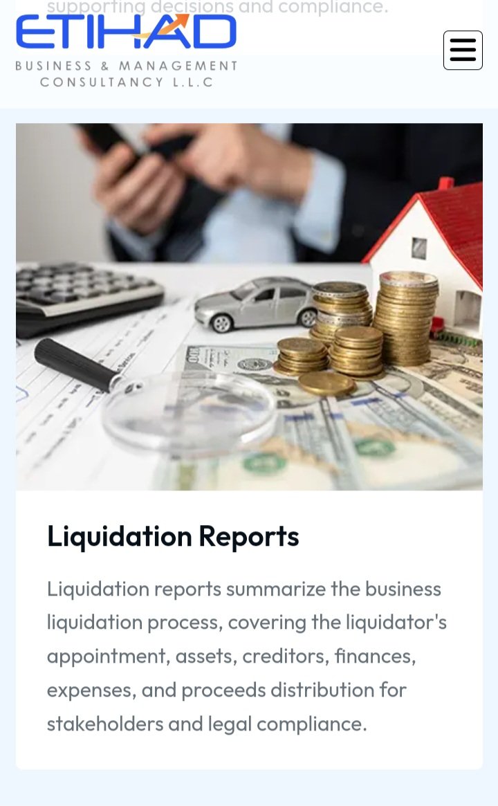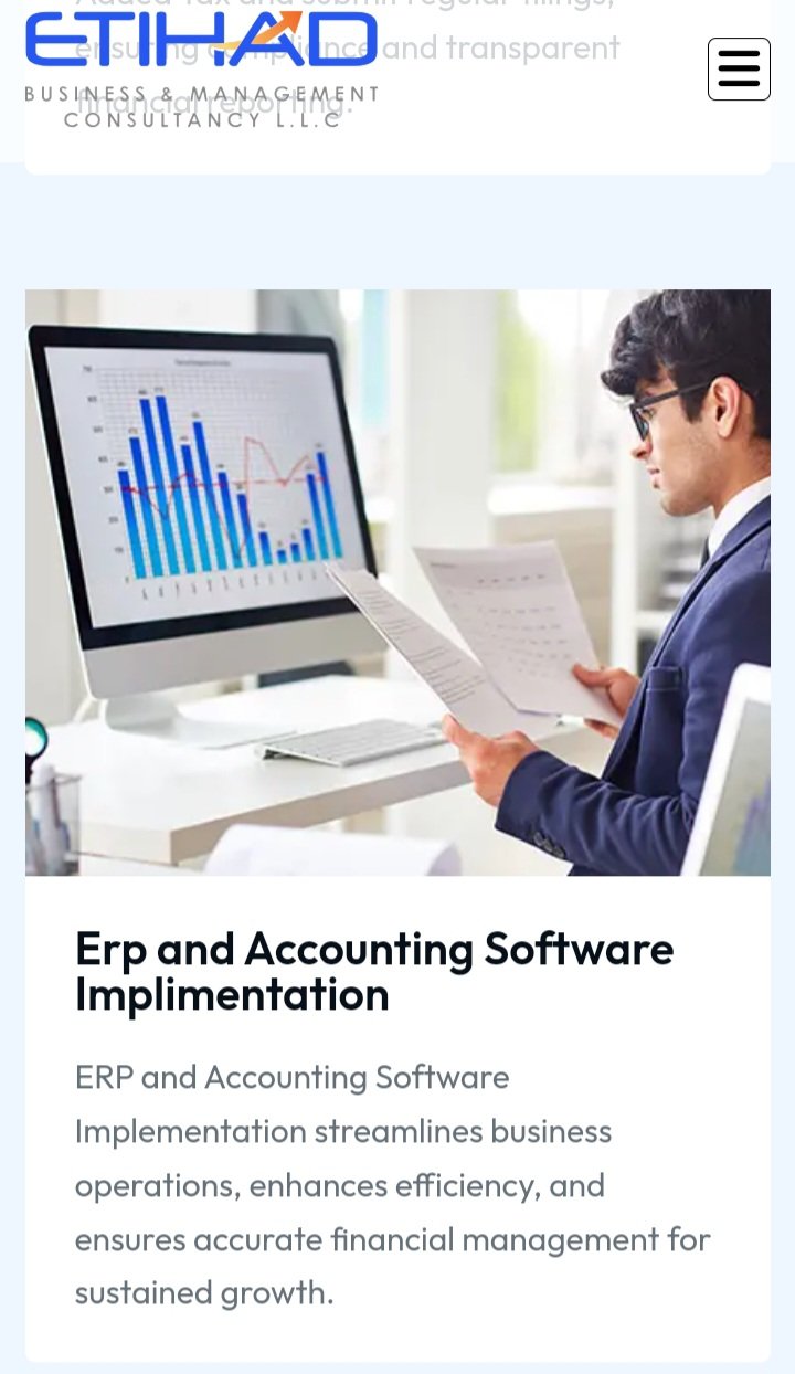 At Etihad Business and Management Consultancy LLC (EBMC), we are a young and energetic team of professionals committed to provide the highest quality of complete and diversified range of professional services to our clients, including Accounting, Book Keeping, Auditing Activities, Feasibility Studies, Taxation and Company Formation. As a firm we understand our clients’ needs efficiently. We believe that every client we serve deserves value adding service which is guided by our eight pillars of success which are quality, honesty, integrity, openness, availability, reliability, responsiveness and pro-activeness.